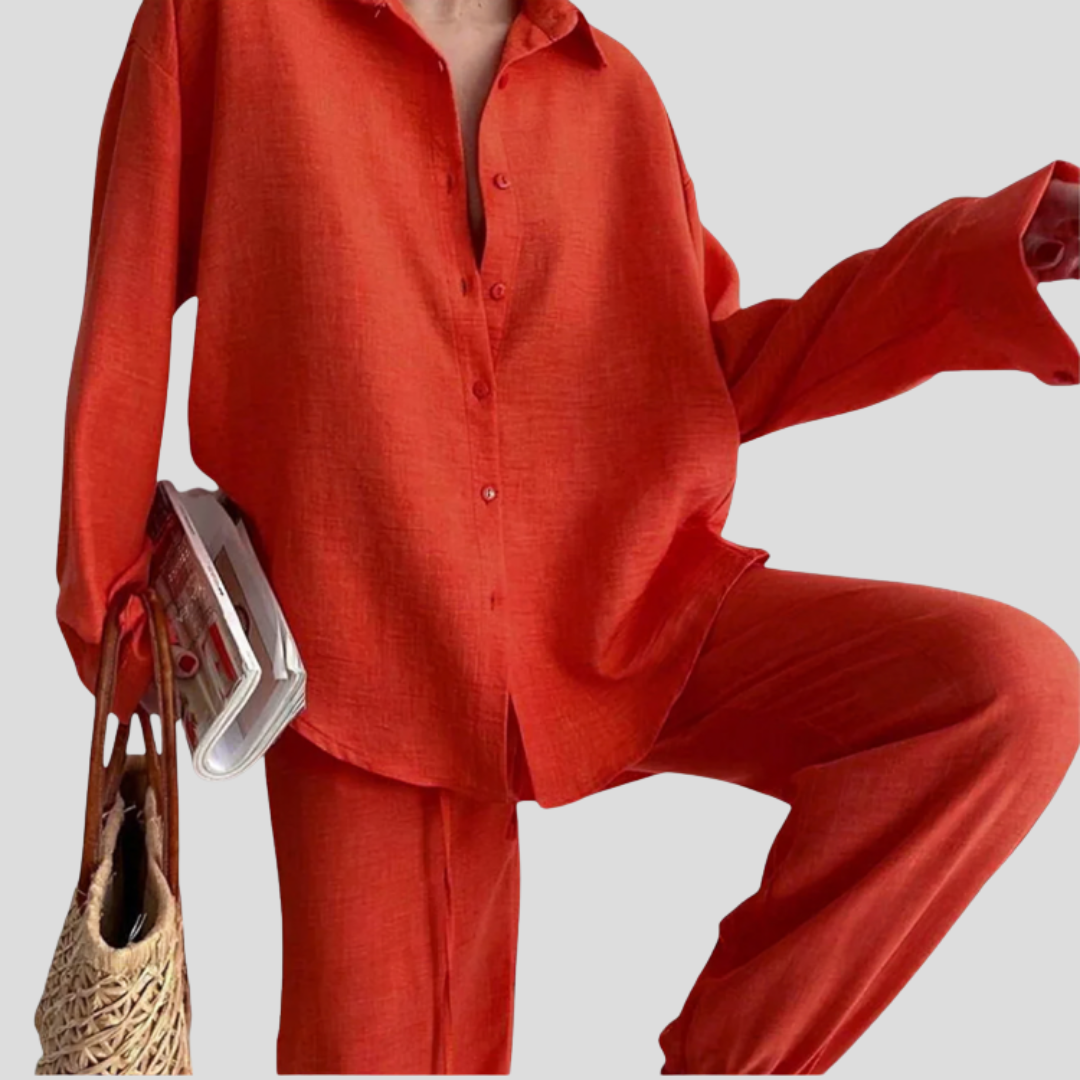 Antonella è l’emblema dello stile senza sforzo: un completo due pezzi composto da un top leggero e pantaloni a gamba larga, perfetto per chi cerca eleganza e libertà nei mesi più caldi.